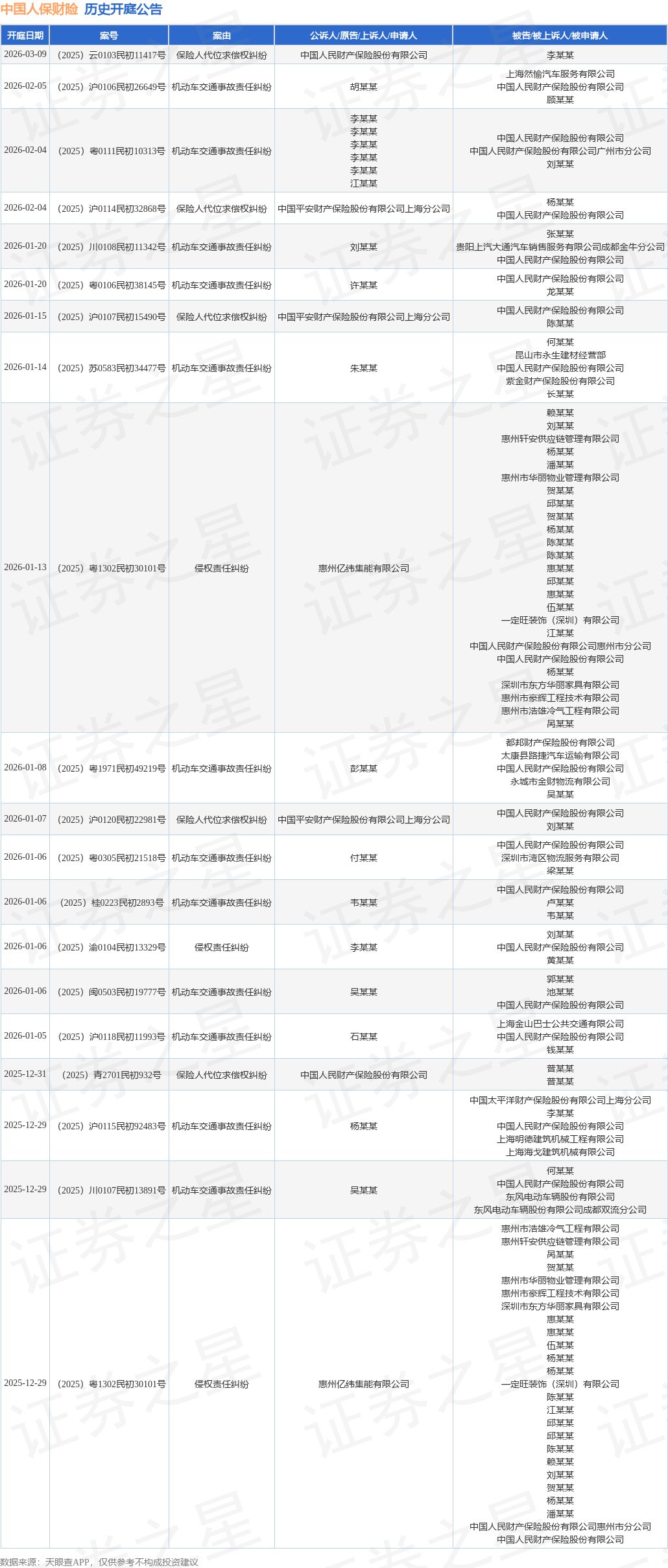案号:(2025)闽0128民初4880号根据统计,近一年内以中国人民财产保险股份有限公司为当事人的历史开庭公告有1924则,其中案由为“机动车交通事故责任纠纷”的公告以1321则居首,其次为“保险人代位求偿权纠纷”有158则,“交通事故”有66则。历史开庭公告(前20条)如下: