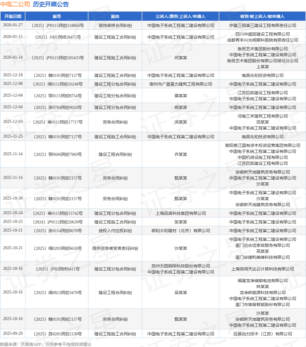 案号:(2025)闽0111民初10248号根据统计,近一年内以中国电子系统工程第二建设有限公司为当事人的历史开庭公告有179则,其中案由为“追索劳动报酬纠纷”的公告以46则居首,其次为“分期付款买卖合同纠纷”有41则,“建设工程施工合同纠纷”有21则。历史开庭公告(前20条)如下: