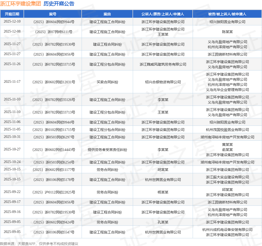 案号:(2025)浙07民终6111号根据统计,近一年内以浙江环宇建设集团有限公司为当事人的历史开庭公告有70则,其中案由为“建设工程施工合同纠纷”的公告以15则居首,其次为“建设工程分包合同纠纷”有12则,“劳务合同纠纷”有10则。历史开庭公告(前20条)如下: