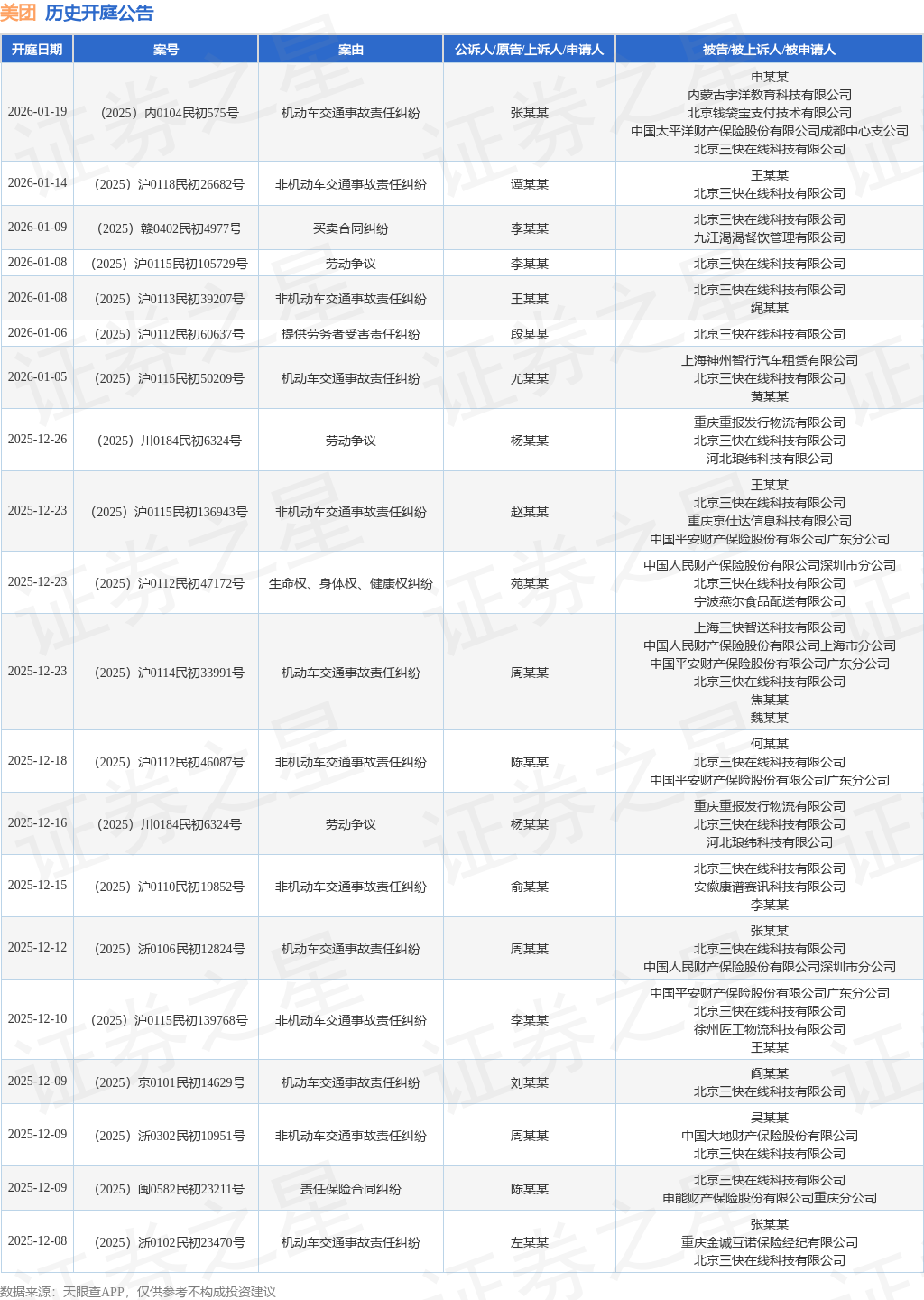 案号:(2025)浙0102民初23470号根据统计,近一年内以北京三快在线科技有限公司为当事人的历史开庭公告有449则,其中案由为“非机动车交通事故责任纠纷”的公告以144则居首,其次为“机动车交通事故责任纠纷”有59则,“劳动争议”有51则。历史开庭公告(前20条)如下: