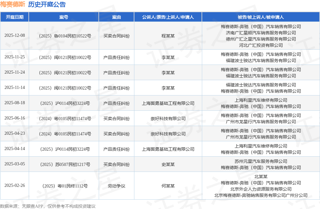 案号:(2025)鲁0104民初10522号根据统计,近一年内以梅赛德斯-奔驰(中国)汽车销售有限公司为当事人的历史开庭公告有10则,其中案由为“产品责任纠纷”的公告以5则居首,其次为“买卖合同纠纷”有4则,“劳动争议”有1则。历史开庭公告如下: