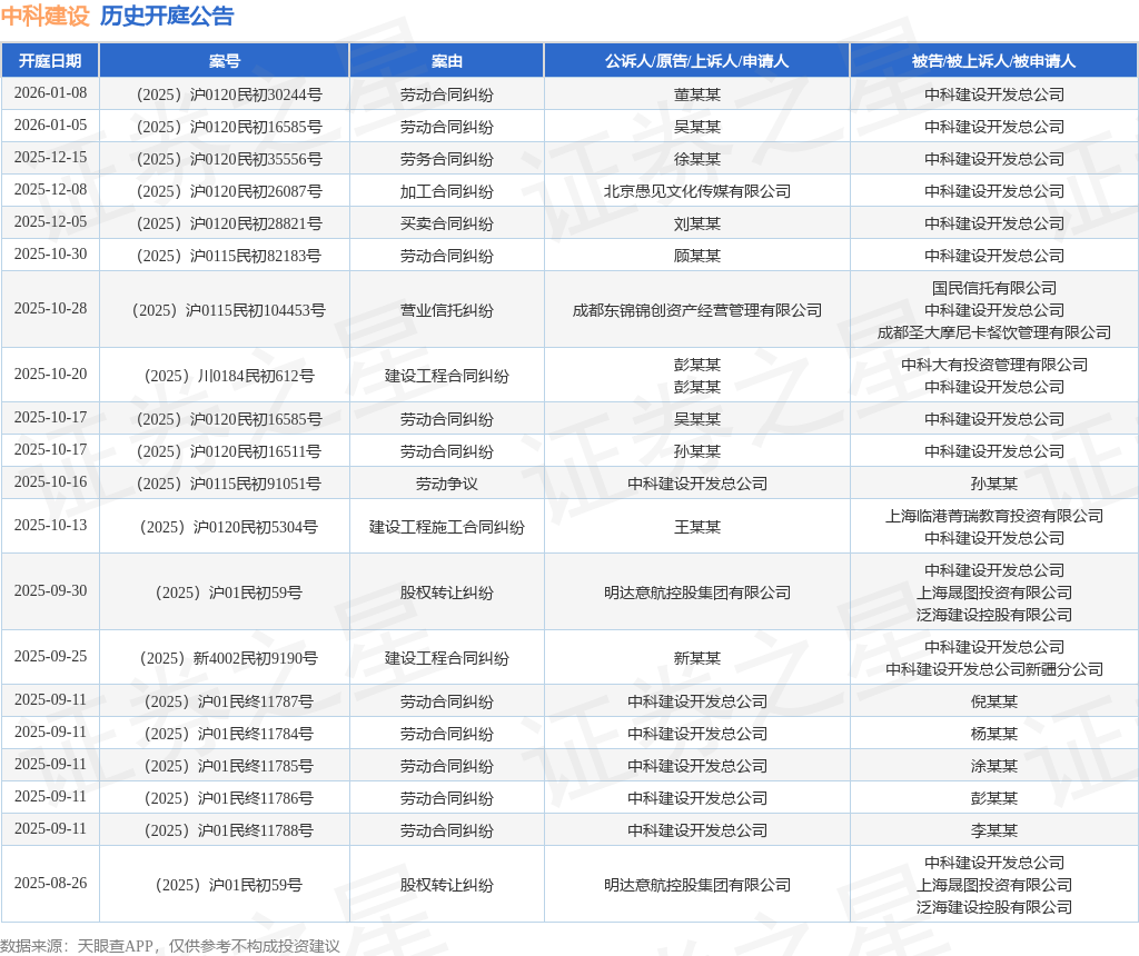 案号:(2025)沪0120民初26087号根据统计,近一年内以中科建设开发总公司为当事人的历史开庭公告有54则,其中案由为“劳动合同纠纷”的公告以12则居首,其次为“建设工程施工合同纠纷”有8则,“劳务合同纠纷”有7则。历史开庭公告(前20条)如下: