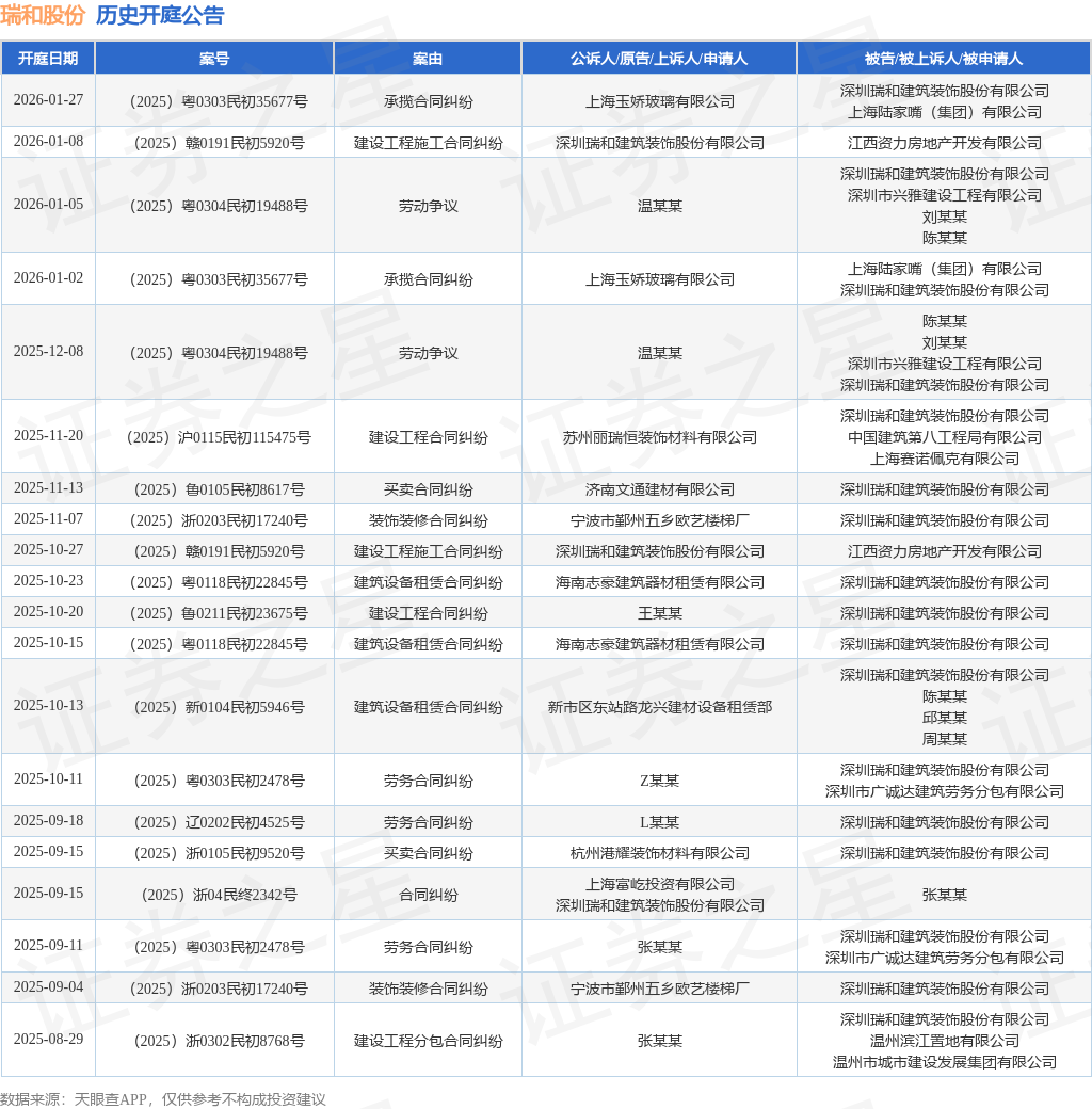 案号:(2025)粤0304民初19488号根据统计,近一年内以深圳瑞和建筑装饰股份有限公司为当事人的历史开庭公告有115则,其中案由为“买卖合同纠纷”的公告以23则居首,其次为“劳务合同纠纷”有23则,“建设工程施工合同纠纷”有17则。历史开庭公告(前20条)如下: