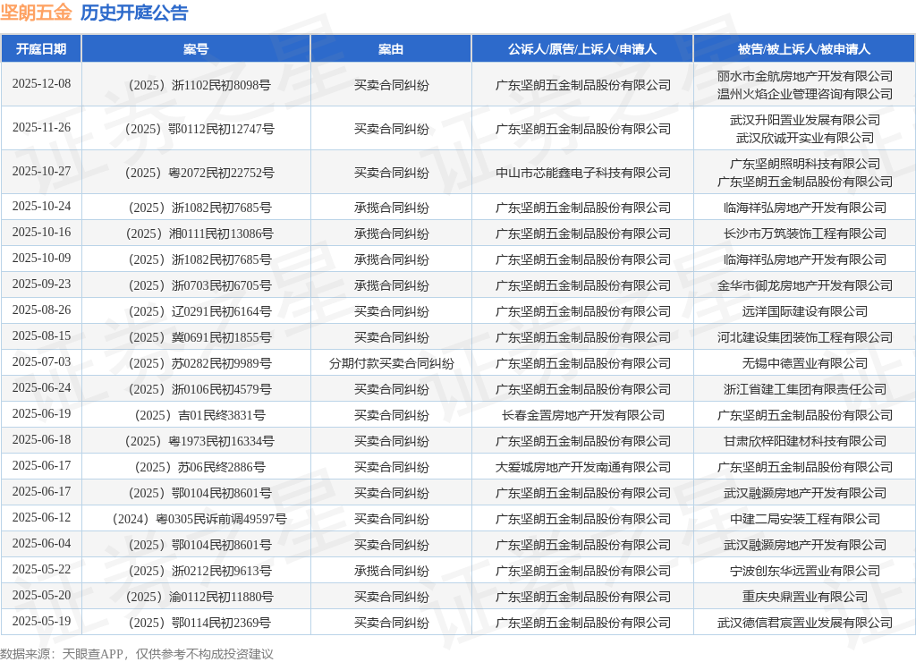 案号:(2025)浙1102民初8098号根据统计,近一年内以广东坚朗五金制品股份有限公司为当事人的历史开庭公告有57则,其中案由为“买卖合同纠纷”的公告以39则居首,其次为“票据追索权纠纷”有6则,“承揽合同纠纷”有5则。历史开庭公告(前20条)如下: