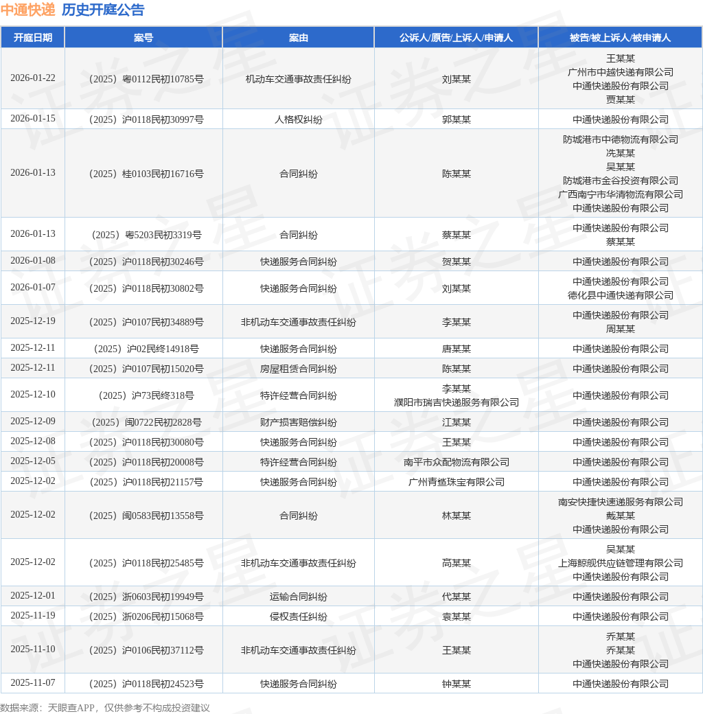 案号:(2025)沪0118民初30080号根据统计,近一年内以中通快递股份有限公司为当事人的历史开庭公告有144则,其中案由为“快递服务合同纠纷”的公告以47则居首,其次为“特许经营合同纠纷”有16则,“非机动车交通事故责任纠纷”有9则。历史开庭公告(前20条)如下: