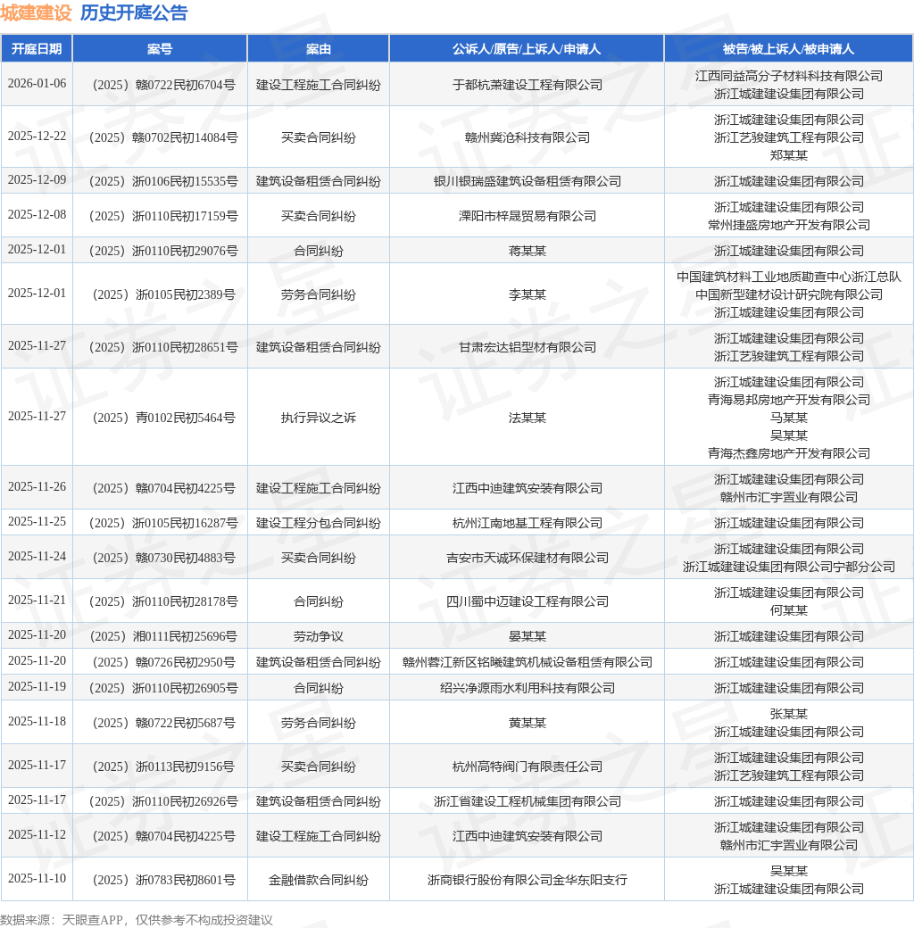 案号:(2025)浙0110民初17159号根据统计,近一年内以浙江城建建设集团有限公司为当事人的历史开庭公告有260则,其中案由为“买卖合同纠纷”的公告以68则居首,其次为“建设工程施工合同纠纷”有36则,“建筑设备租赁合同纠纷”有31则。历史开庭公告(前20条)如下:
