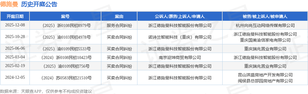 根据统计,近一年内以浙江德施曼科技智能股份有限公司为当事人的历史开庭公告有6则,其中案由为“买卖合同纠纷”的公告以5则居首,其次为“服务合同纠纷”有1则。历史开庭公告如下: