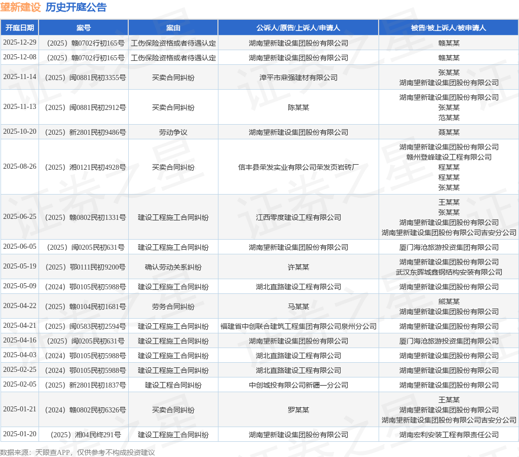 案号:(2025)赣0702行初165号根据统计,近一年内以湖南望新建设集团股份有限公司为当事人的历史开庭公告有18则,其中案由为“建设工程施工合同纠纷”的公告以8则居首,其次为“买卖合同纠纷”有4则,“工伤保险资格或者待遇认定”有2则。历史开庭公告如下: