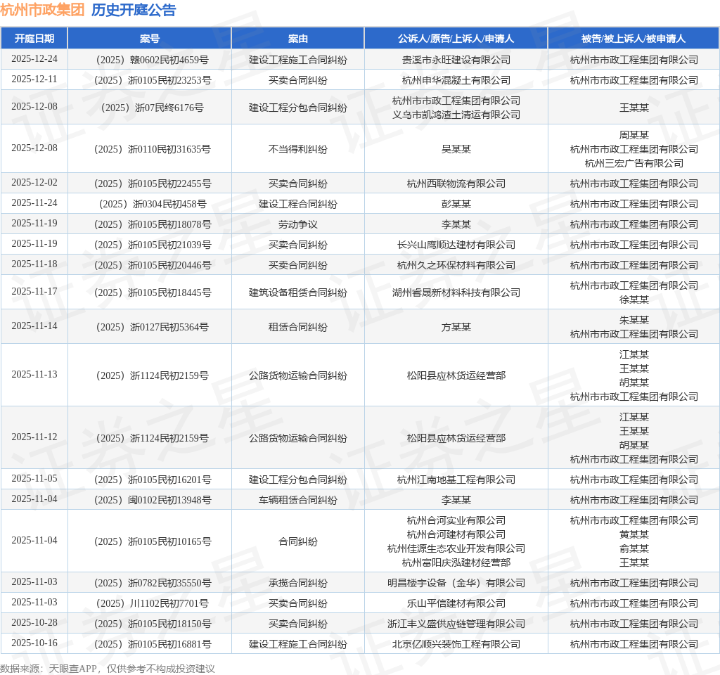 案号:(2025)浙0110民初31635号根据统计,近一年内以杭州市市政工程集团有限公司为当事人的历史开庭公告有91则,其中案由为“买卖合同纠纷”的公告以25则居首,其次为“建设工程施工合同纠纷”有22则,“建设工程合同纠纷”有8则。历史开庭公告(前20条)如下:
