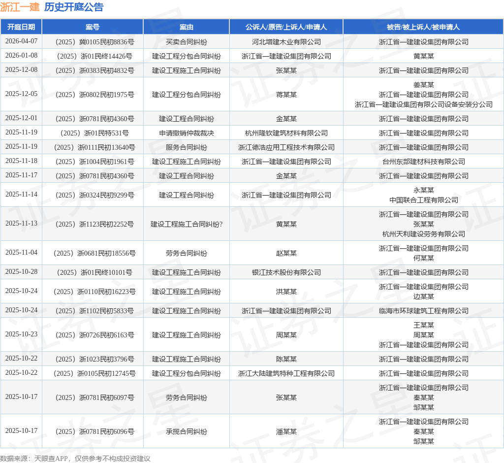 案号:(2025)浙0383民初4832号根据统计,近一年内以浙江省一建建设集团有限公司为当事人的历史开庭公告有113则,其中案由为“建设工程施工合同纠纷”的公告以39则居首,其次为“劳务合同纠纷”有14则,“建设工程分包合同纠纷”有13则。历史开庭公告(前20条)如下: