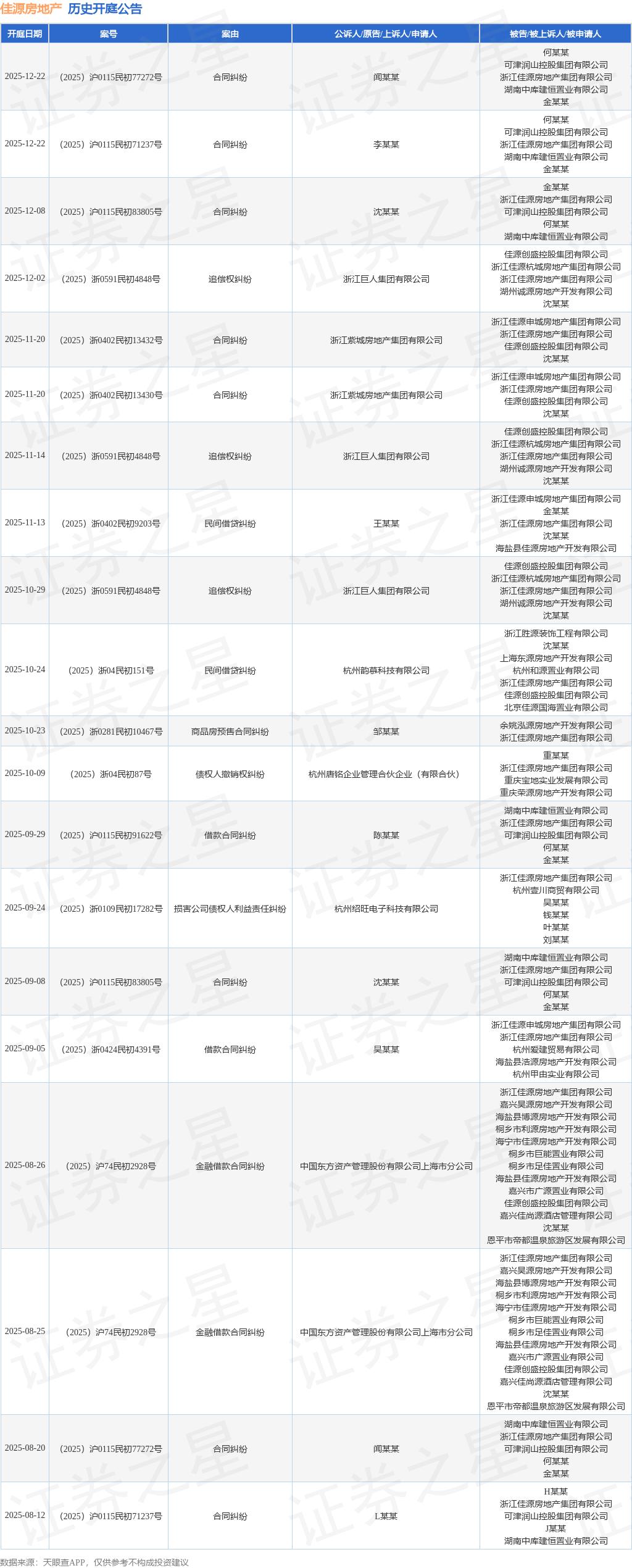 案号:(2025)沪0115民初83805号根据统计,近一年内以浙江佳源房地产集团有限公司为当事人的历史开庭公告有46则,其中案由为“合同纠纷”的公告以18则居首,其次为“金融借款合同纠纷”有8则,“民间借贷纠纷”有4则。历史开庭公告(前20条)如下: