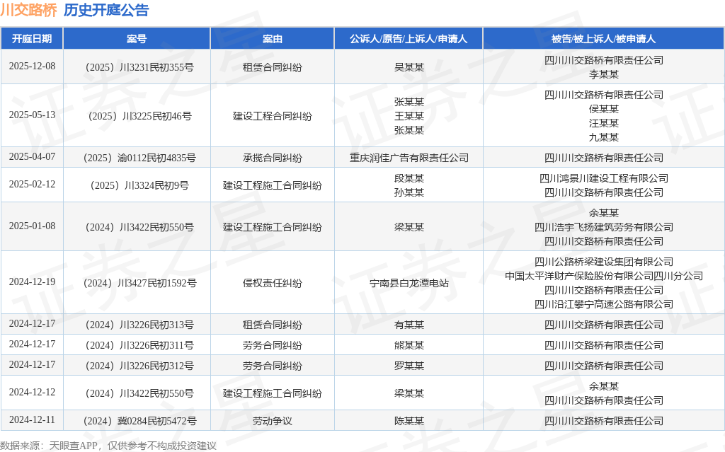 证券之星消息,根据天眼查APP显示,近日公布了一则四川川交路桥有限责任公司作为被告/被上诉人的开庭公告,详细内容如下: