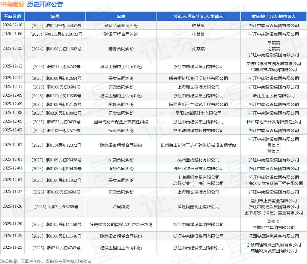 案号:(2025)浙0326民初10002号根据统计,近一年内以浙江中南建设集团有限公司为当事人的历史开庭公告有313则,其中案由为“买卖合同纠纷”的公告以79则居首,其次为“建设工程施工合同纠纷”有61则,“建设工程分包合同纠纷”有42则。历史开庭公告(前20条)如下: