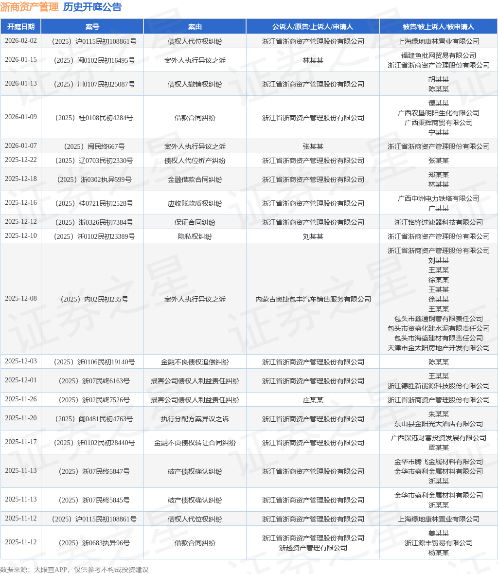案号:(2025)内02民初235号根据统计,近一年内以浙江省浙商资产管理股份有限公司为当事人的历史开庭公告有217则,其中案由为“案外人执行异议之诉”的公告以36则居首,其次为“清算责任纠纷”有17则,“合同纠纷”有15则。历史开庭公告(前20条)如下: