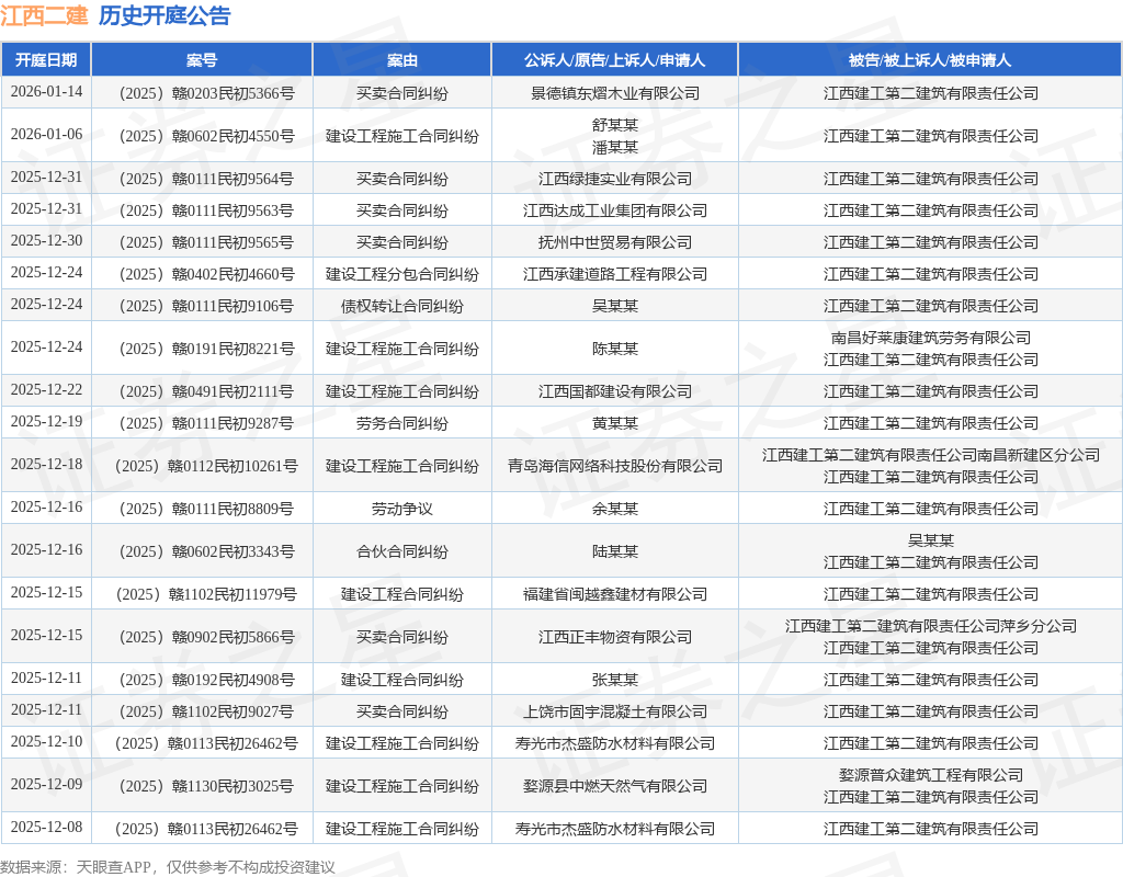 案号:(2025)赣0124民初6209号根据统计,近一年内以江西建工第二建筑有限责任公司为当事人的历史开庭公告有288则,其中案由为“买卖合同纠纷”的公告以110则居首,其次为“建设工程施工合同纠纷”有77则,“建设工程合同纠纷”有18则。历史开庭公告(前20条)如下: