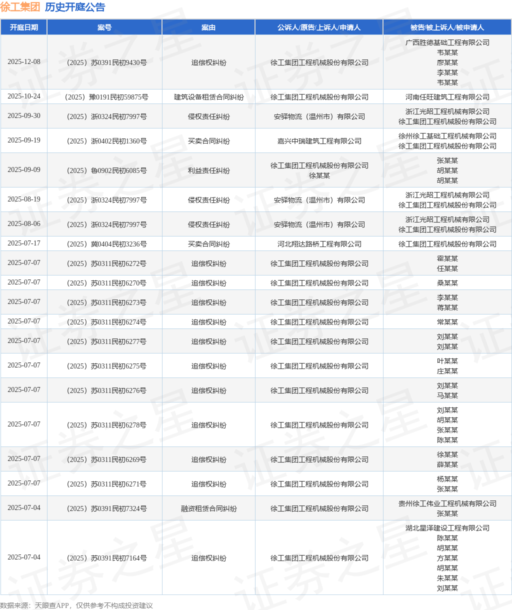 案号:(2025)苏0391民初9430号根据统计,近一年内以徐工集团工程机械股份有限公司为当事人的历史开庭公告有125则,其中案由为“追偿权纠纷”的公告以92则居首,其次为“买卖合同纠纷”有17则,“串通投标不正当竞争纠纷”有3则。历史开庭公告(前20条)如下:
