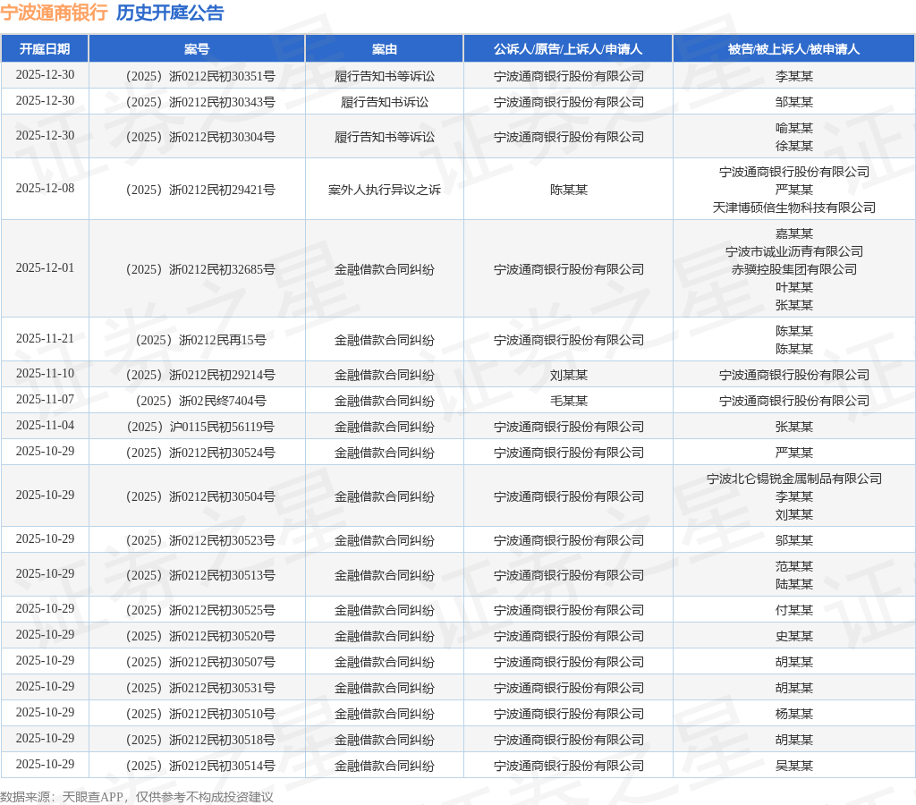 案号:(2025)浙0212民初29421号根据统计,近一年内以宁波通商银行股份有限公司为当事人的历史开庭公告有45则,其中案由为“金融借款合同纠纷”的公告以36则居首,其次为“侵权责任纠纷”有3则,“履行告知书等诉讼”有2则。历史开庭公告(前20条)如下: