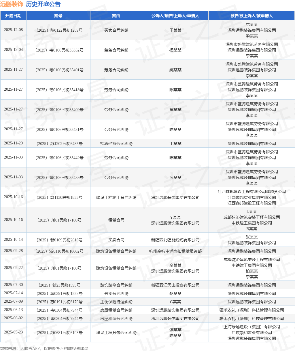 案号:(2025)陕0122民初1289号根据统计,近一年内以深圳远鹏装饰集团有限公司为当事人的历史开庭公告有40则,其中案由为“买卖合同纠纷”的公告以9则居首,其次为“劳务合同纠纷”有7则,“建设工程分包合同纠纷”有5则。历史开庭公告(前20条)如下: