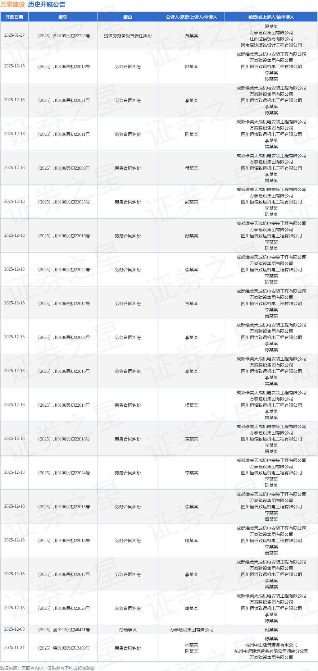 案号:(2025)渝0112民初48421号根据统计,近一年内以万泰建设集团有限公司为当事人的历史开庭公告有398则,其中案由为“买卖合同纠纷”的公告以98则居首,其次为“劳务合同纠纷”有81则,“劳动争议”有66则。历史开庭公告(前20条)如下: