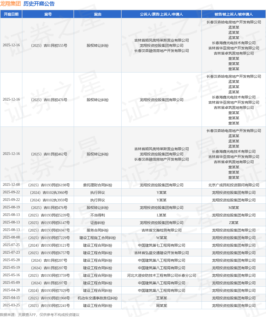 案号:(2025)吉0193民初6198号根据统计,近一年内以龙翔投资控股集团有限公司为当事人的历史开庭公告有30则,其中案由为“建设工程合同纠纷”的公告以16则居首,其次为“股权转让纠纷”有4则,“执行异议”有2则。历史开庭公告(前20条)如下: