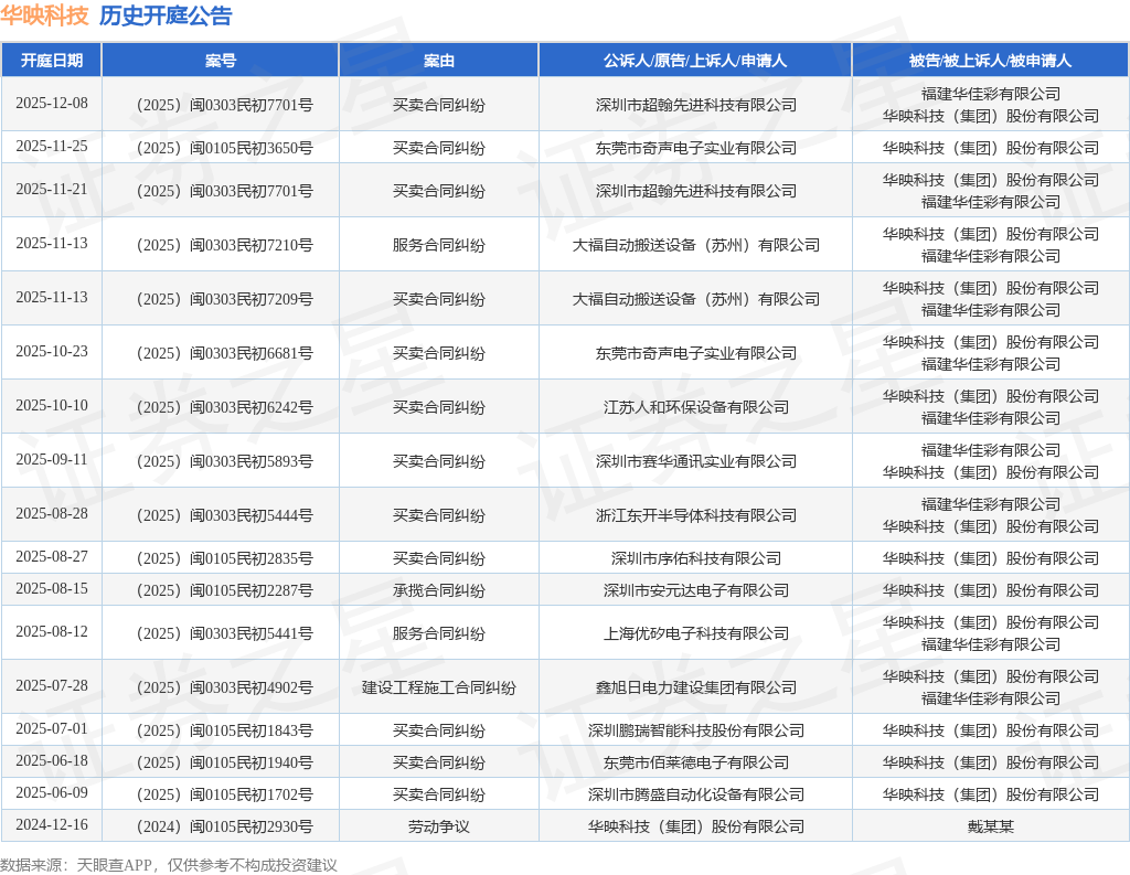 案号:(2025)闽0303民初7701号根据统计,近一年内以华映科技(集团)股份有限公司为当事人的历史开庭公告有17则,其中案由为“买卖合同纠纷”的公告以12则居首,其次为“服务合同纠纷”有2则,“劳动争议”有1则。历史开庭公告如下: