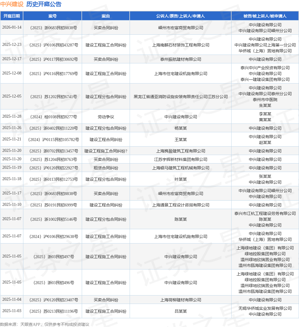 案号:(2025)沪0116民初17769号根据统计,近一年内以中兴建设有限公司为当事人的历史开庭公告有594则,其中案由为“建设工程施工合同纠纷”的公告以154则居首,其次为“买卖合同纠纷”有103则,“建设工程分包合同纠纷”有91则。历史开庭公告(前20条)如下: