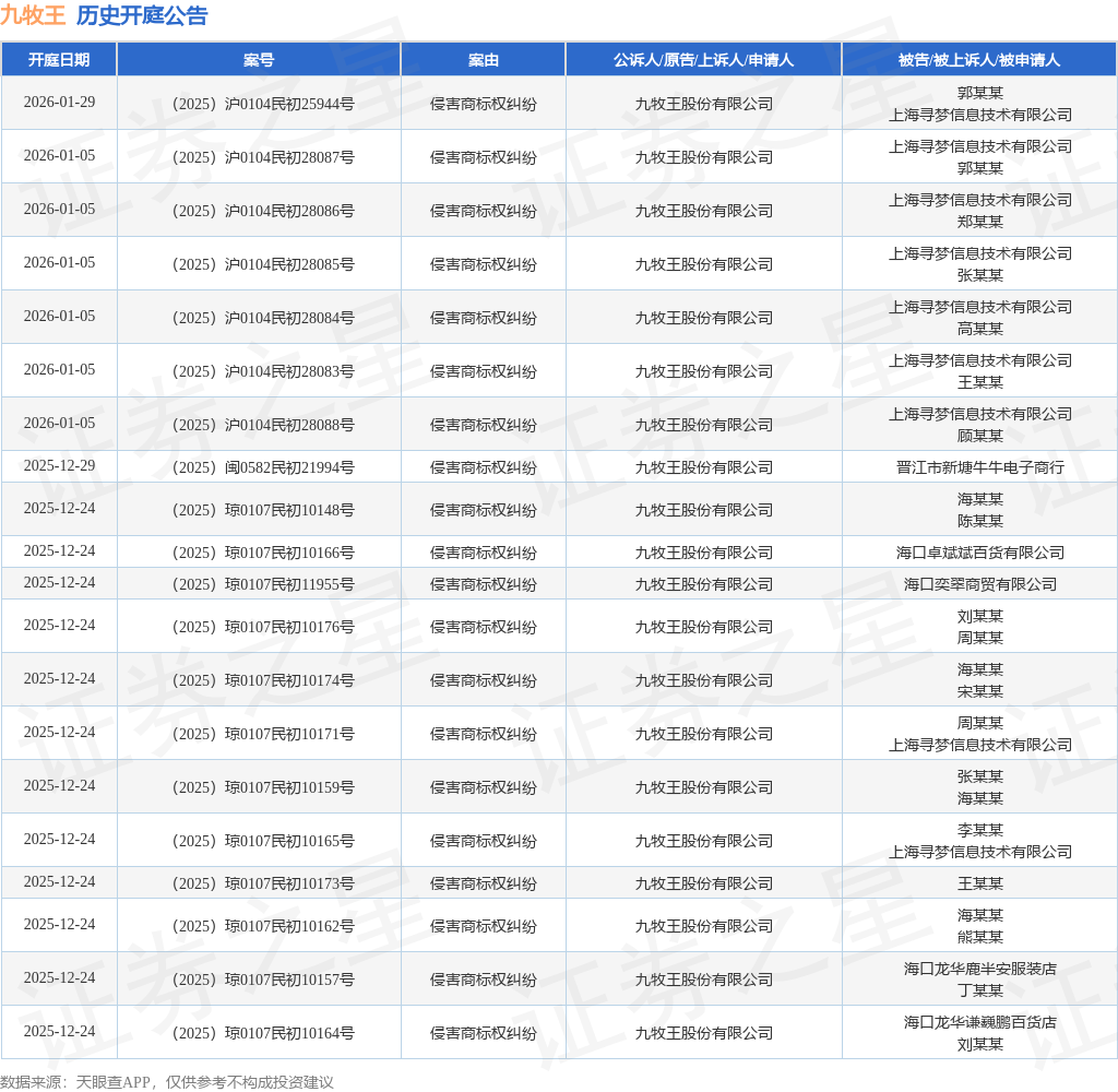 案号:(2025)闽0502民初6611号根据统计,近一年内以九牧王股份有限公司为当事人的历史开庭公告有106则,其中案由为“侵害商标权纠纷”的公告以96则居首,其次为“不正当竞争纠纷”有2则,“劳动争议”有2则。历史开庭公告(前20条)如下: