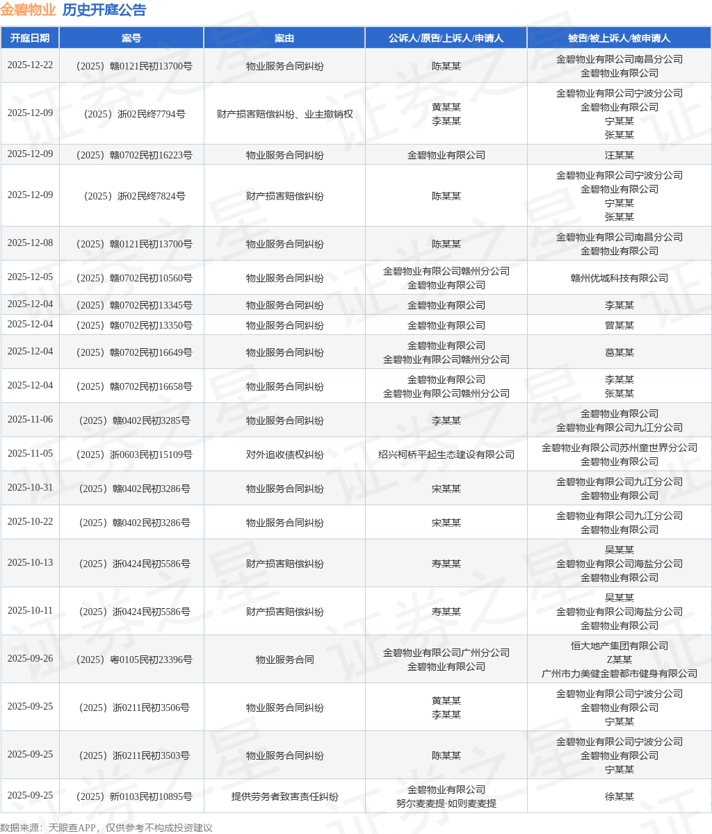 案号:(2025)赣0121民初13700号根据统计,近一年内以金碧物业有限公司为当事人的历史开庭公告有122则,其中案由为“物业服务合同纠纷”的公告以46则居首,其次为“财产损害赔偿纠纷”有12则,“服务合同纠纷”有10则。历史开庭公告(前20条)如下: