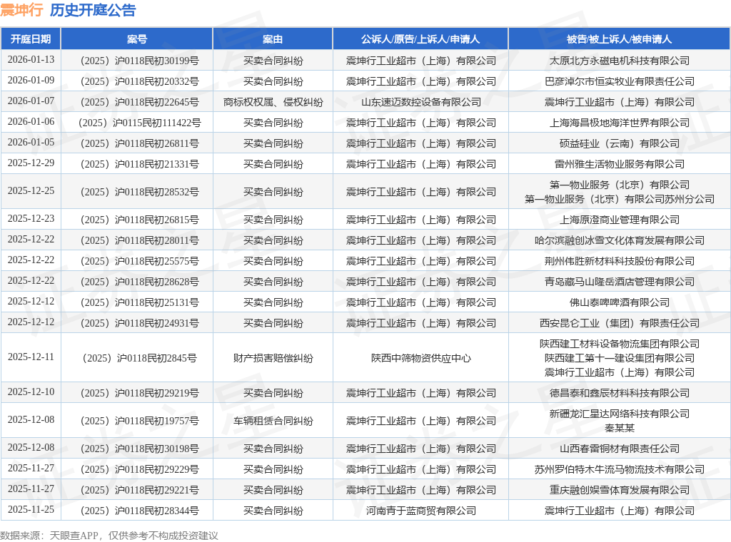案号:(2025)沪0118民初30198号根据统计,近一年内以震坤行工业超市(上海)有限公司为当事人的历史开庭公告有124则,其中案由为“买卖合同纠纷”的公告以107则居首,其次为“股东损害公司债权人利益责任纠纷”有5则,“财产损害赔偿纠纷”有3则。历史开庭公告(前20条)如下: