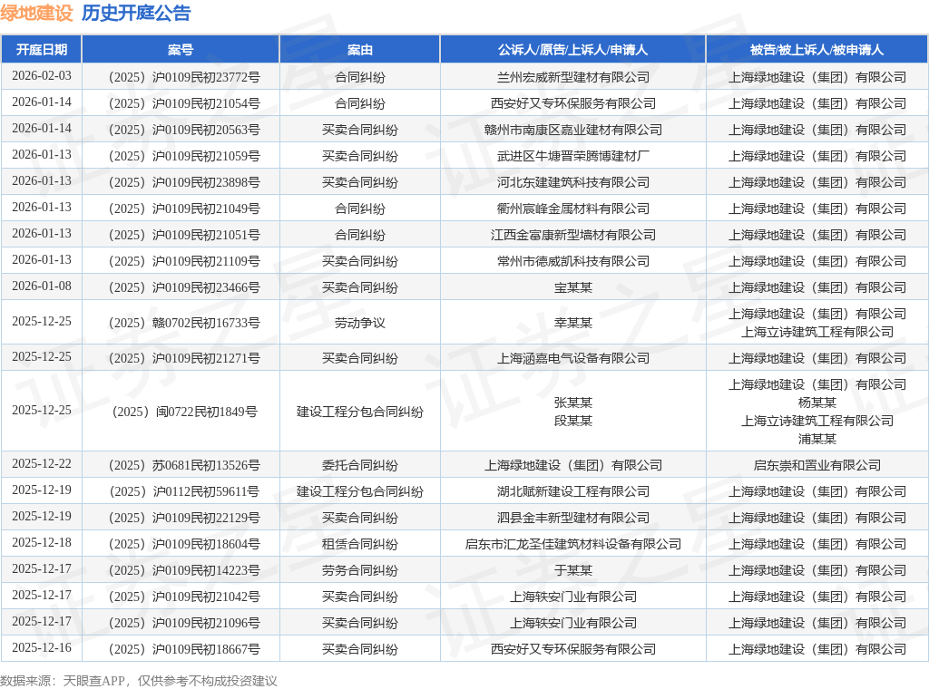 案号:(2025)浙0304民初11978号根据统计,近一年内以上海绿地建设(集团)有限公司为当事人的历史开庭公告有287则,其中案由为“买卖合同纠纷”的公告以70则居首,其次为“建设工程施工合同纠纷”有49则,“建设工程分包合同纠纷”有37则。历史开庭公告(前20条)如下: