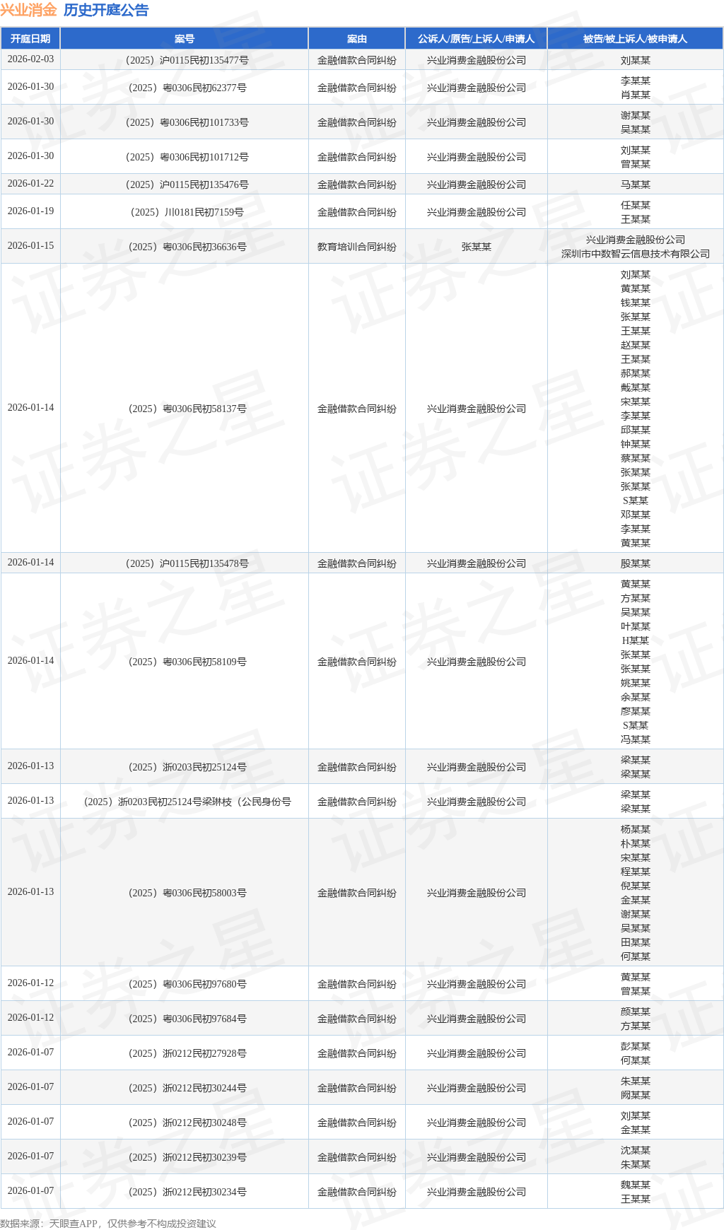 案号:(2025)浙0212民初27967号根据统计,近一年内以兴业消费金融股份公司为当事人的历史开庭公告有14413则,其中案由为“金融借款合同纠纷”的公告以12060则居首,其次为“小额借款合同纠纷”有2054则,“借款”有243则。历史开庭公告(前20条)如下: