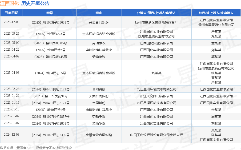 根据统计,近一年内以江西国化实业有限公司为当事人的历史开庭公告有13则,其中案由为“劳动争议”的公告以4则居首,其次为“买卖合同纠纷”有2则,“合同纠纷”有2则。历史开庭公告如下: