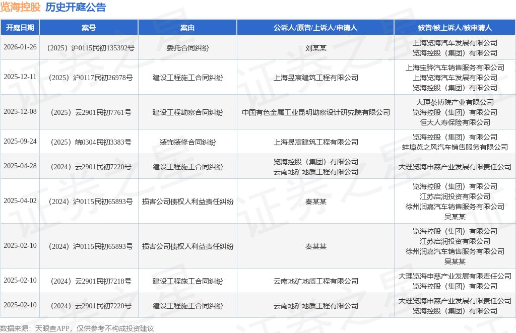 案号:(2025)云2901民初7761号根据统计,近一年内以览海控股(集团)有限公司为当事人的历史开庭公告有9则,其中案由为“建设工程施工合同纠纷”的公告以4则居首,其次为“损害公司债权人利益责任纠纷”有2则,“委托合同纠纷”有1则。历史开庭公告如下:
