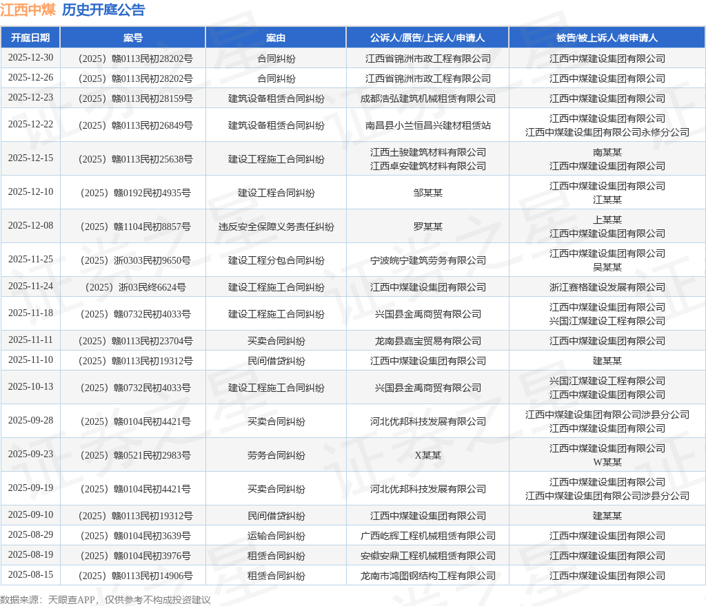 证券之星消息,根据天眼查APP显示,近日公布了一则江西中煤建设集团有限公司作为被告/被上诉人的开庭公告,详细内容如下:
