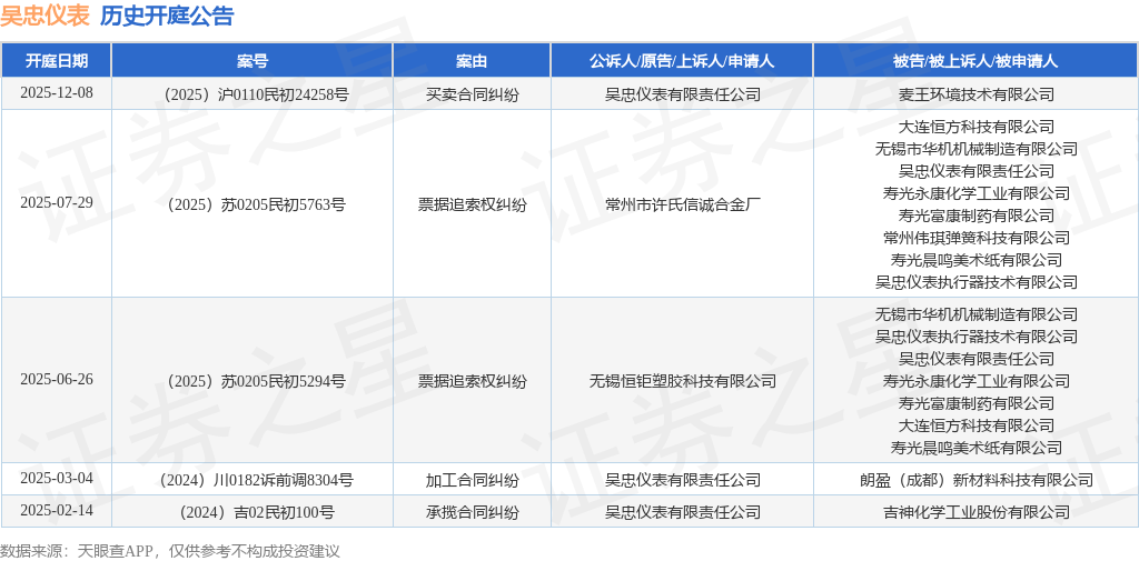 根据统计,近一年内以吴忠仪表有限责任公司为当事人的历史开庭公告有5则,其中案由为“票据追索权纠纷”的公告以2则居首,其次为“买卖合同纠纷”有1则,“加工合同纠纷”有1则。历史开庭公告如下: