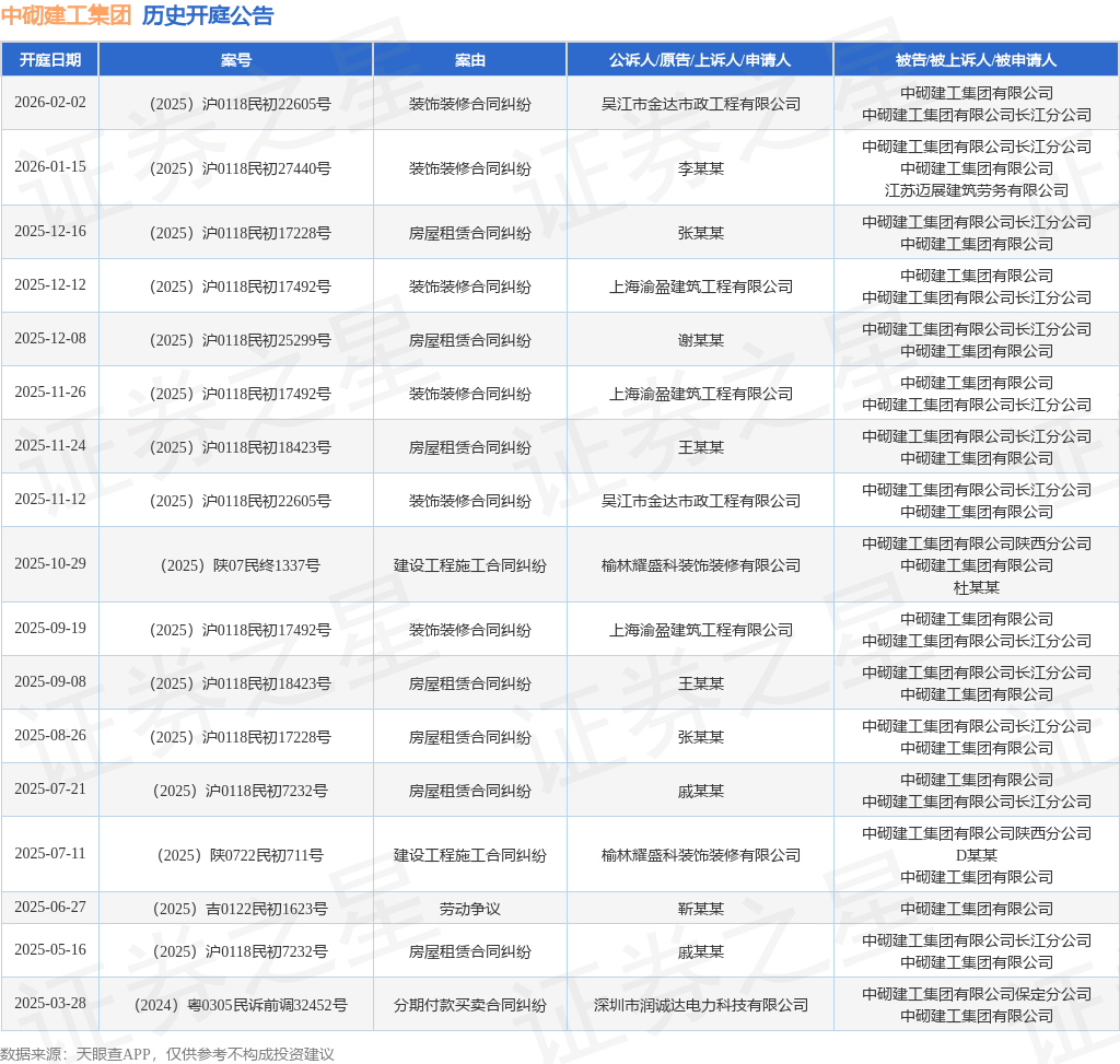 案号:(2025)沪0118民初25299号根据统计,近一年内以中砌建工集团有限公司为当事人的历史开庭公告有17则,其中案由为“房屋租赁合同纠纷”的公告以7则居首,其次为“装饰装修合同纠纷”有6则,“建设工程施工合同纠纷”有2则。历史开庭公告如下: