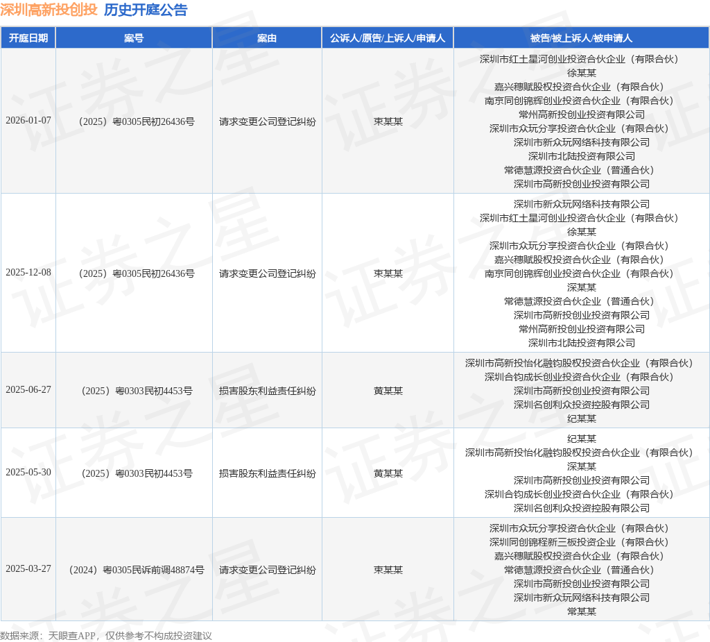 案号:(2025)粤0305民初26436号根据统计,近一年内以深圳市高新投创业投资有限公司为当事人的历史开庭公告有5则,其中案由为“请求变更公司登记纠纷”的公告以3则居首,其次为“损害股东利益责任纠纷”有2则。历史开庭公告如下: