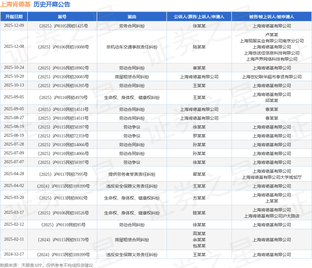 案号:(2025)沪0106民初10088号根据统计,近一年内以上海肯德基有限公司为当事人的历史开庭公告有20则,其中案由为“劳动合同纠纷”的公告以7则居首,其次为“劳动争议”有3则,“生命权、身体权、健康权纠纷”有3则。历史开庭公告如下: