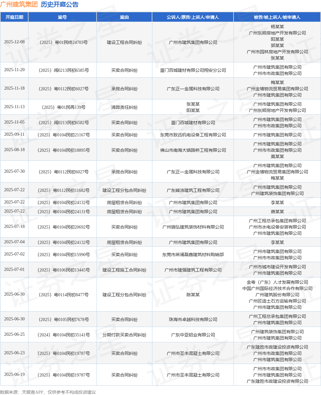 案号:(2025)粤01民终24703号根据统计,近一年内以广州市建筑集团有限公司为当事人的历史开庭公告有64则,其中案由为“买卖合同纠纷”的公告以39则居首,其次为“分期付款买卖合同纠纷”有5则,“建设工程施工合同纠纷”有4则。历史开庭公告(前20条)如下: