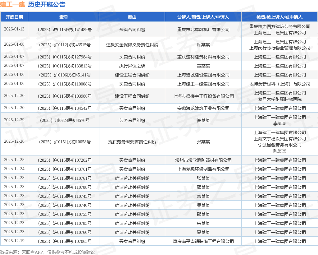 案号:(2025)沪0115民初131559号根据统计,近一年内以上海建工一建集团有限公司为当事人的历史开庭公告有320则,其中案由为“买卖合同纠纷”的公告以79则居首,其次为“建设工程施工合同纠纷”有39则,“劳动争议”有37则。历史开庭公告(前20条)如下: