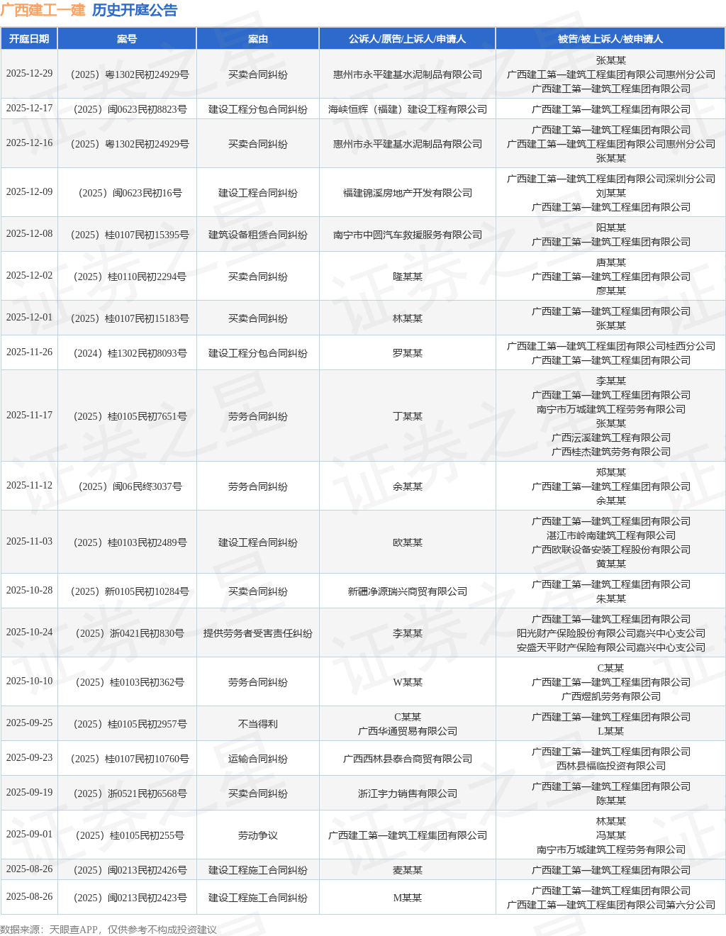 案号:(2025)桂0107民初15395号根据统计,近一年内以广西建工第一建筑工程集团有限公司为当事人的历史开庭公告有113则,其中案由为“买卖合同纠纷”的公告以23则居首,其次为“建设工程施工合同纠纷”有17则,“劳务合同纠纷”有16则。历史开庭公告(前20条)如下: