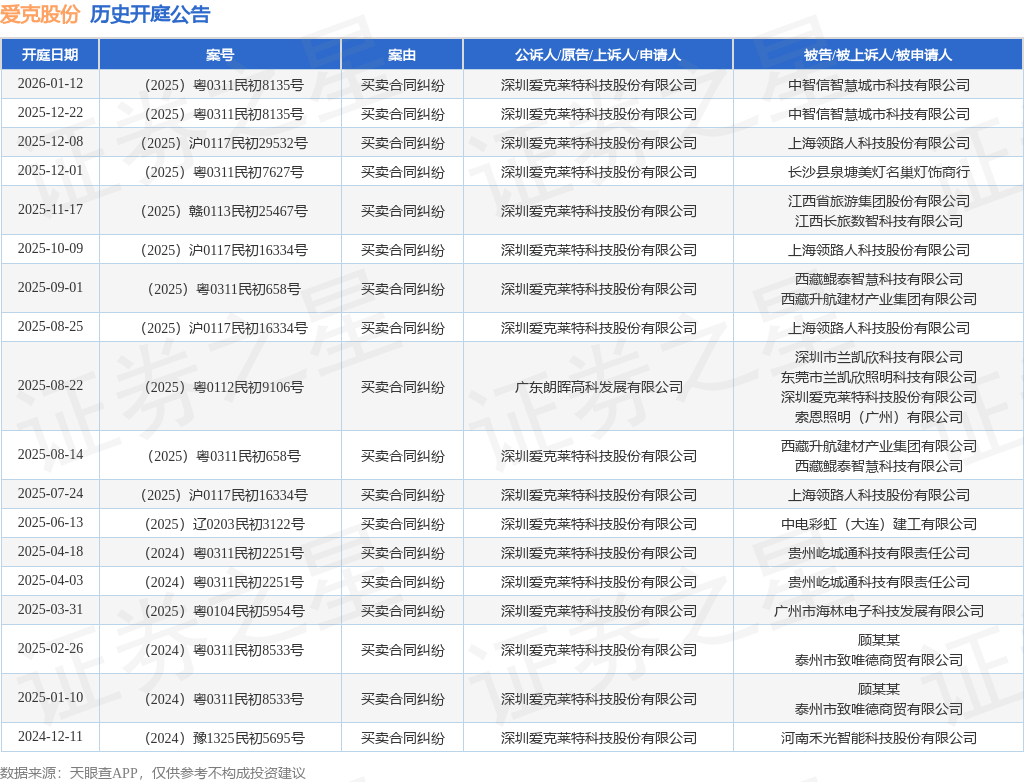 根据统计,近一年内以深圳爱克莱特科技股份有限公司为当事人的历史开庭公告有18则,其中案由为“买卖合同纠纷”的公告以18则居首。历史开庭公告如下:
