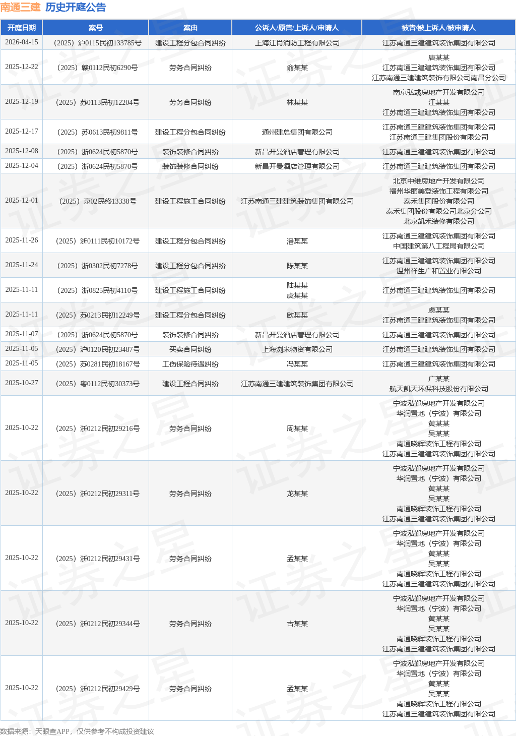 案号:(2025)浙0624民初5870号根据统计,近一年内以江苏南通三建建筑装饰集团有限公司为当事人的历史开庭公告有242则,其中案由为“劳务合同纠纷”的公告以54则居首,其次为“买卖合同纠纷”有43则,“建设工程分包合同纠纷”有35则。历史开庭公告(前20条)如下: