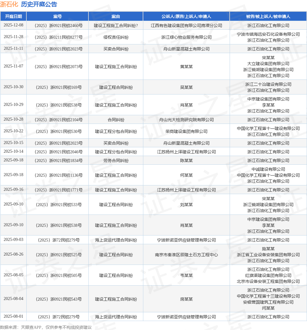 案号:(2025)浙0921民初2460号根据统计,近一年内以浙江石油化工有限公司为当事人的历史开庭公告有55则,其中案由为“建设工程合同纠纷”的公告以21则居首,其次为“建设工程施工合同纠纷”有12则,“建设工程分包合同纠纷”有4则。历史开庭公告(前20条)如下: