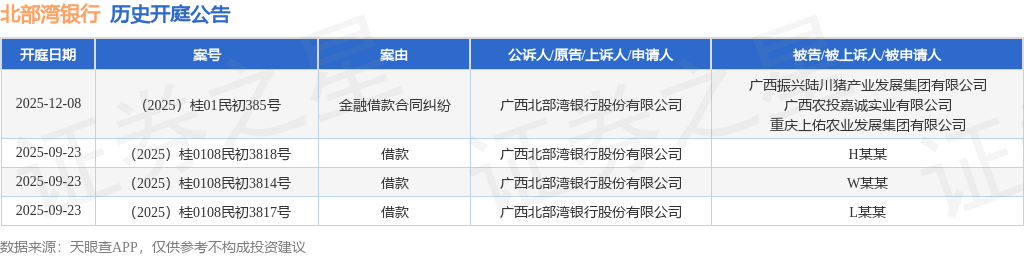 根据统计,近一年内以广西北部湾银行股份有限公司为当事人的历史开庭公告有4则,其中案由为“借款”的公告以3则居首,其次为“金融借款合同纠纷”有1则。历史开庭公告如下: