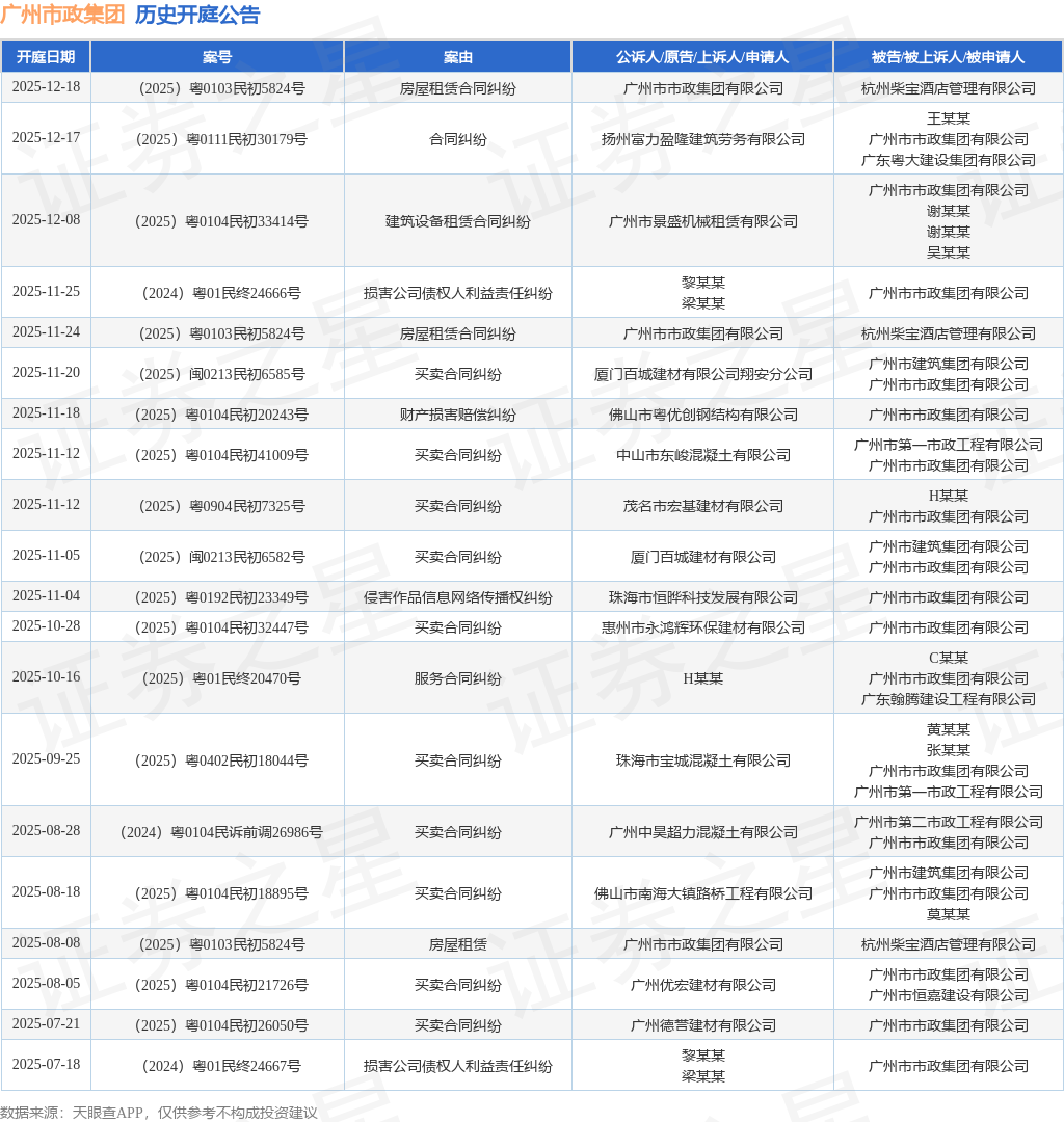 案号:(2025)粤0104民初33414号根据统计,近一年内以广州市市政集团有限公司为当事人的历史开庭公告有114则,其中案由为“买卖合同纠纷”的公告以51则居首,其次为“损害公司债权人利益责任纠纷”有13则,“建设工程施工合同纠纷”有8则。历史开庭公告(前20条)如下: