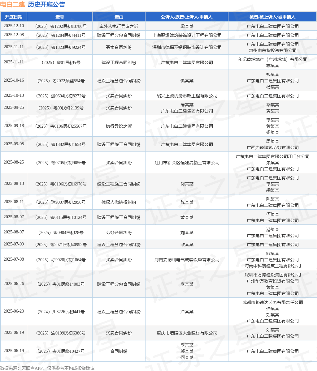 案号:(2025)粤1284民初4411号根据统计,近一年内以广东电白二建集团有限公司为当事人的历史开庭公告有118则,其中案由为“劳务合同纠纷”的公告以44则居首,其次为“买卖合同纠纷”有20则,“建设工程施工合同纠纷”有15则。历史开庭公告(前20条)如下: