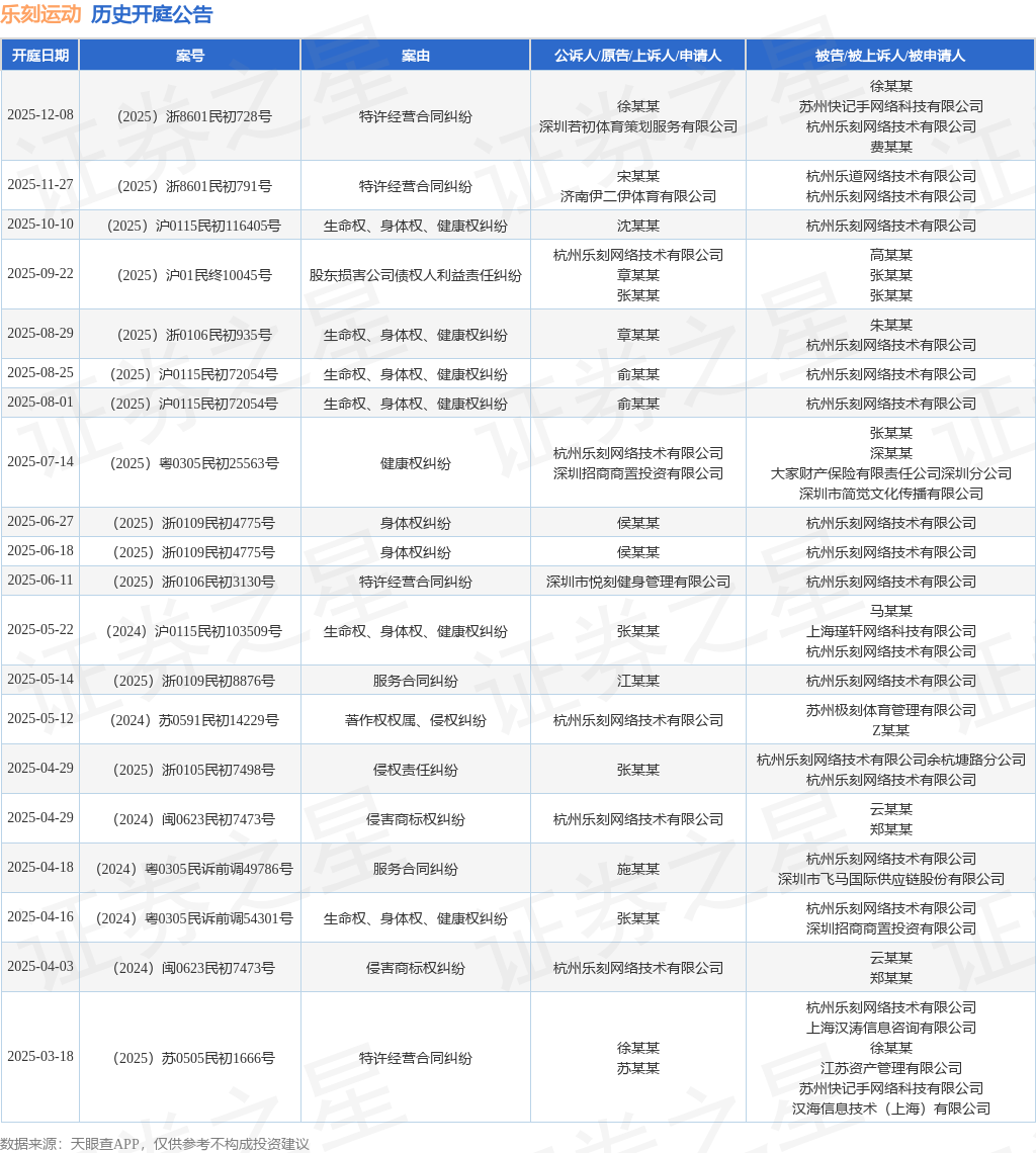 案号:(2025)浙8601民初728号根据统计,近一年内以杭州乐刻网络技术有限公司为当事人的历史开庭公告有26则,其中案由为“生命权、身体权、健康权纠纷”的公告以7则居首,其次为“侵害商标权纠纷”有4则,“特许经营合同纠纷”有4则。历史开庭公告(前20条)如下:
