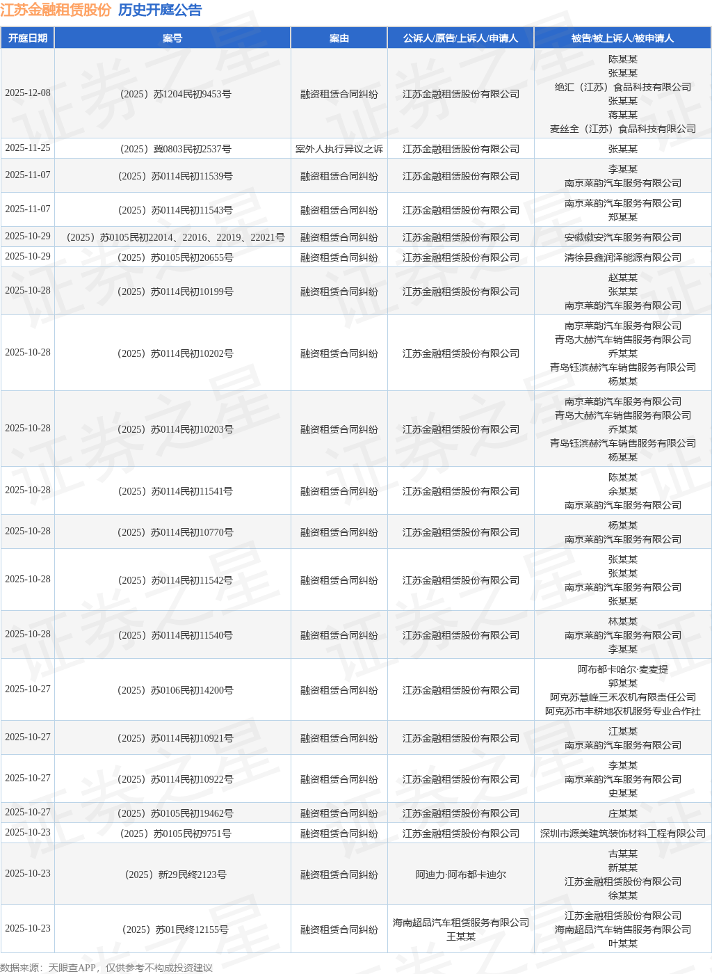 案号:(2025)苏1204民初9453号根据统计,近一年内以江苏金融租赁股份有限公司为当事人的历史开庭公告有778则,其中案由为“融资租赁合同纠纷”的公告以756则居首,其次为“租赁合同纠纷”有7则,“买卖合同纠纷”有4则。历史开庭公告(前20条)如下: