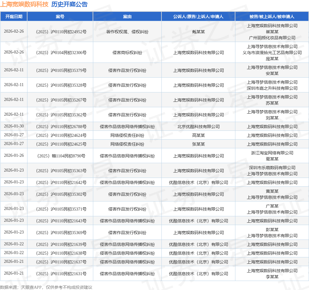 案号:(2025)沪0110民初26938号根据统计,近一年内以上海宽娱数码科技有限公司为当事人的历史开庭公告有748则,其中案由为“侵害作品信息网络传播权纠纷”的公告以394则居首,其次为“著作权权属、侵权纠纷”有147则,“网络侵权责任纠纷”有58则。历史开庭公告(前20条)如下: